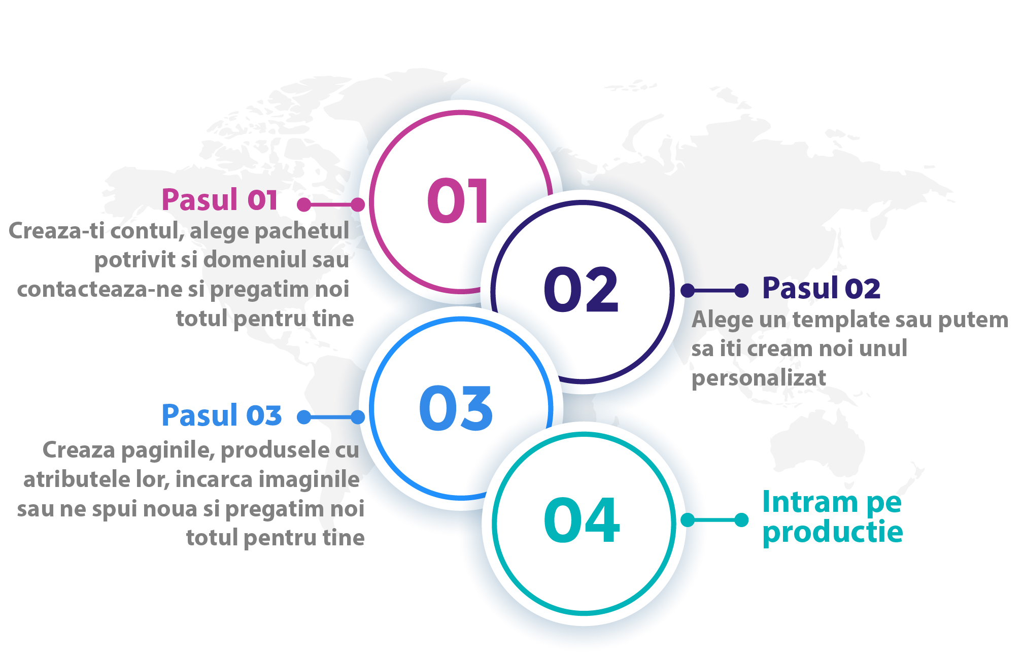 - Pe platforma Shopia iti creezi paginile, produsele cu atributele lor si detaliile produselor sau serviciilor, adaugi reduceri, acorzi tichete de reducere sau poti apela la noi si le incarcam pentru tine.