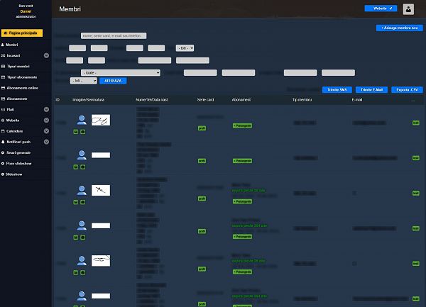 Adăugarea membrilor si a abonamentelor se realizează simplu. Soluția are inclusa emiterea automata a facturilor daca este cazul si trimiterea in RO eFactura automat sau manual, este integrata si cu smartbill si cu casa de marcat Datecs si se poate integra cu alt sistem de gestiune ce permite integrarea pe baza de API. Se pot filtra membrii in funcție de tipul abonamentului, data expirării sau alți parametri și li se pot trimite mesaje prin SMS integrat cu soluția de gestiune sau prin e-mail.