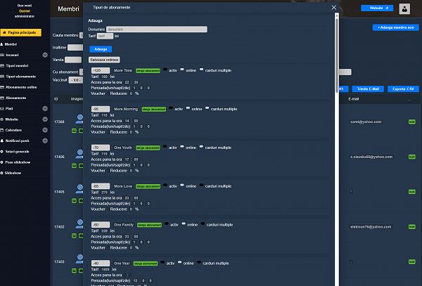 Abonamentele se pot defini cu ușurință prin meniul dedicat pentru gestiunea abonamentelor, completând 2 câmpuri cu numele abonamentului si tariful. Ulterior se pot defini alți parametri ca și perioada abonamentului, perioada de acces. Sistemul de vouchere si reduceri pus la dispoziție de soluția noastră se îmbină foarte bine cu campaniile promoționale ce poate dorești sa le pornești.